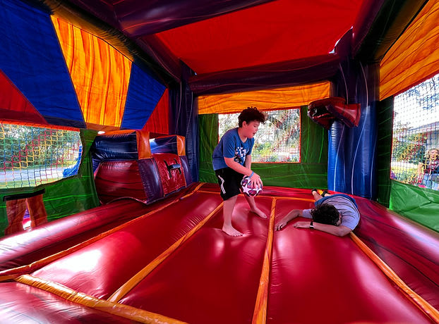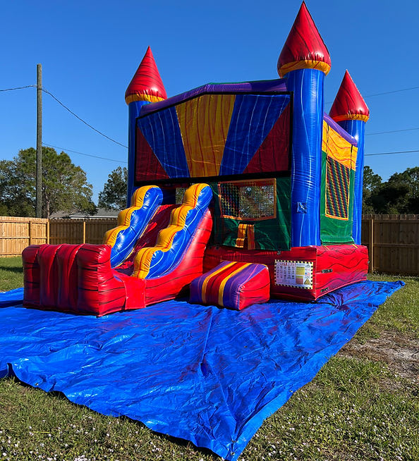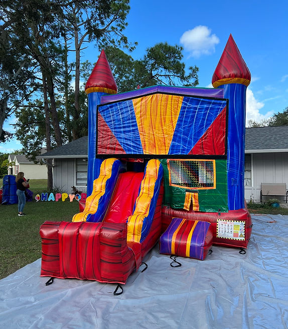 Bounce house and slide combo with dry attachment and basketball hoop inside